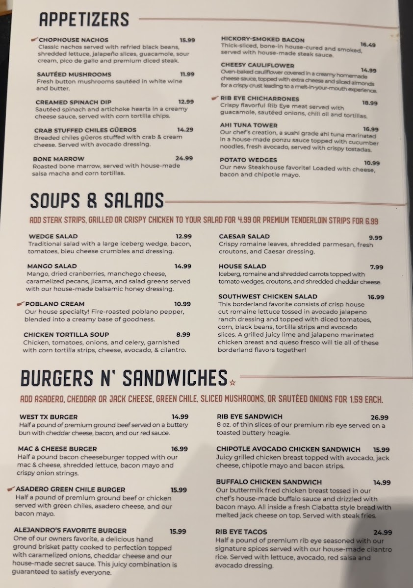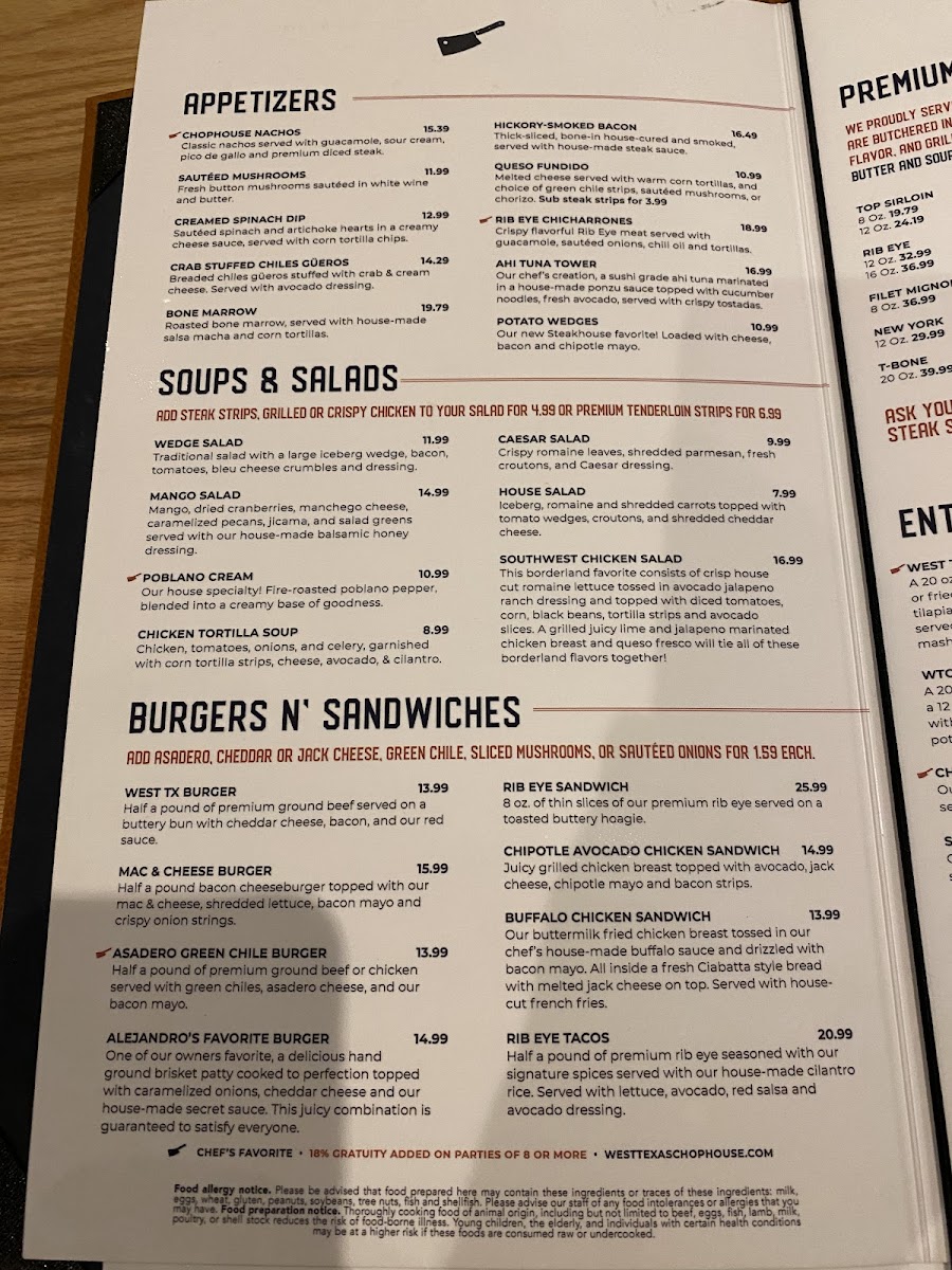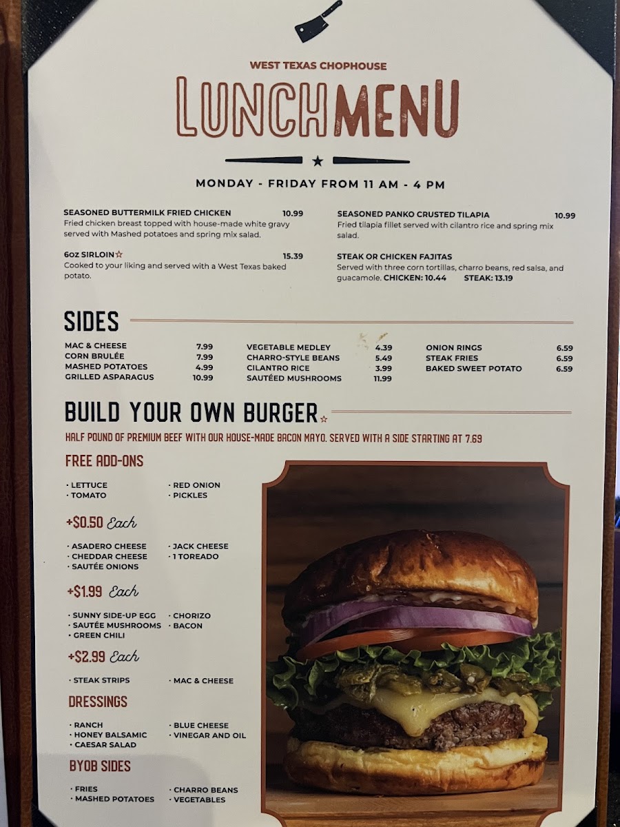 The atmosphere at West Texas Chophouse is warm and inviting, reminiscent of classic steakhouses where good food is a focal point of the experience. It’s a great spot for a date night, family gathering, or a casual dinner with friends, where you can enjoy a delicious meal while soaking in the charming vibe.
