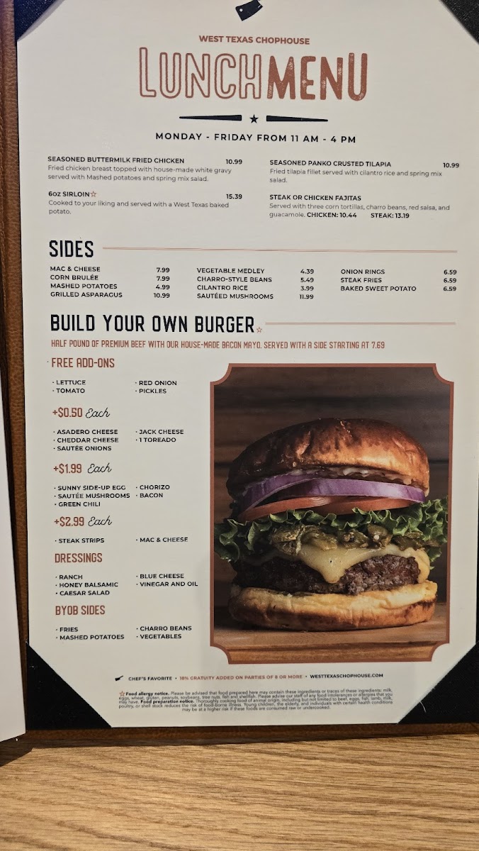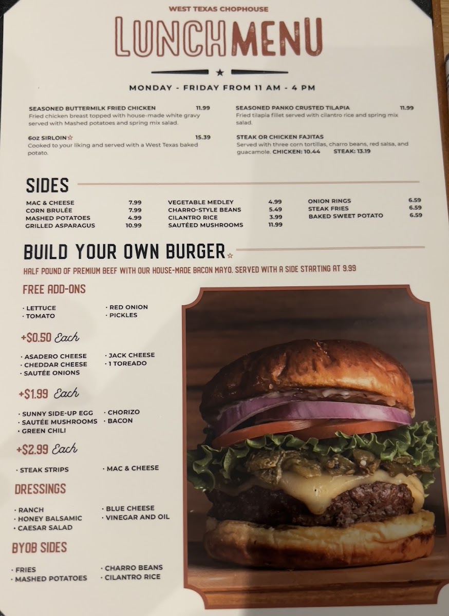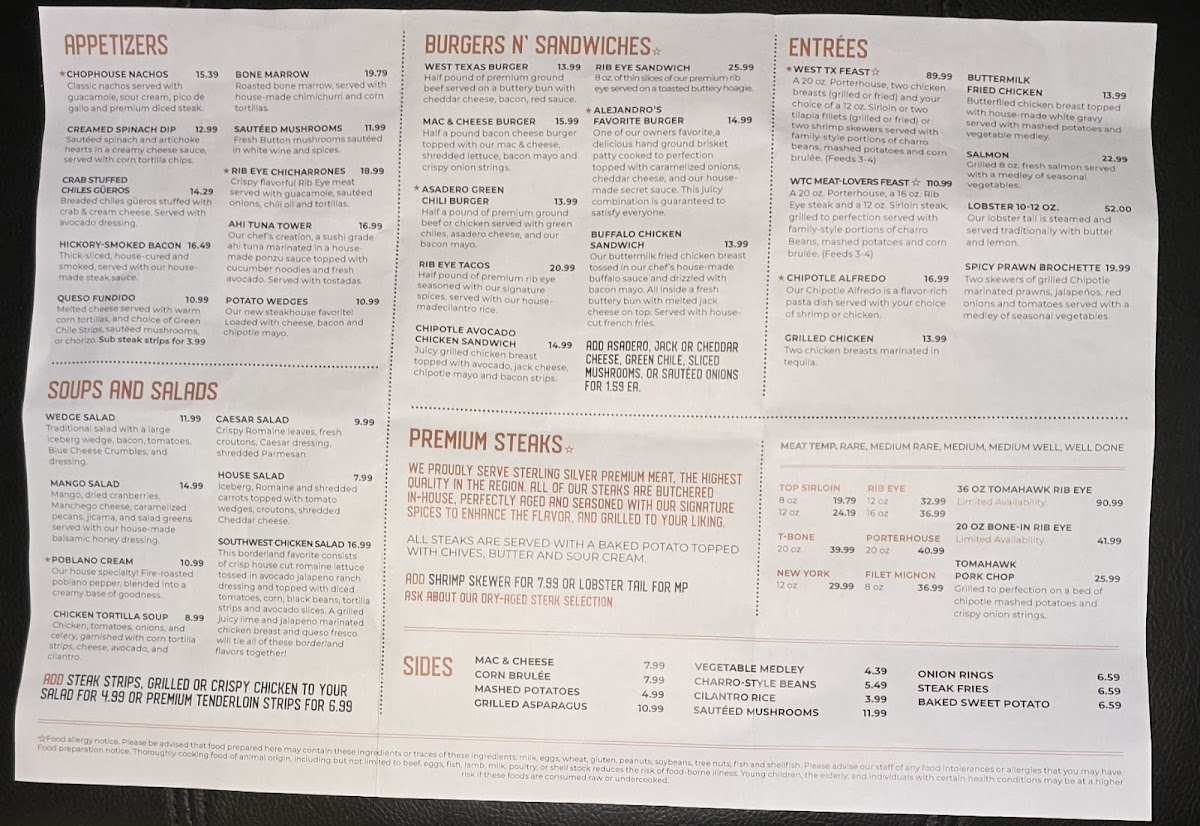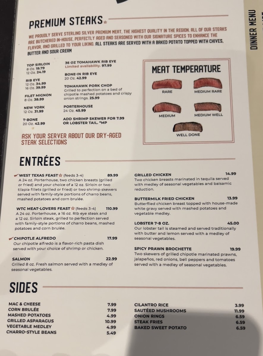 The atmosphere at West Texas Chophouse is warm and inviting, reminiscent of classic steakhouses where good food is a focal point of the experience. It’s a great spot for a date night, family gathering, or a casual dinner with friends, where you can enjoy a delicious meal while soaking in the charming vibe.